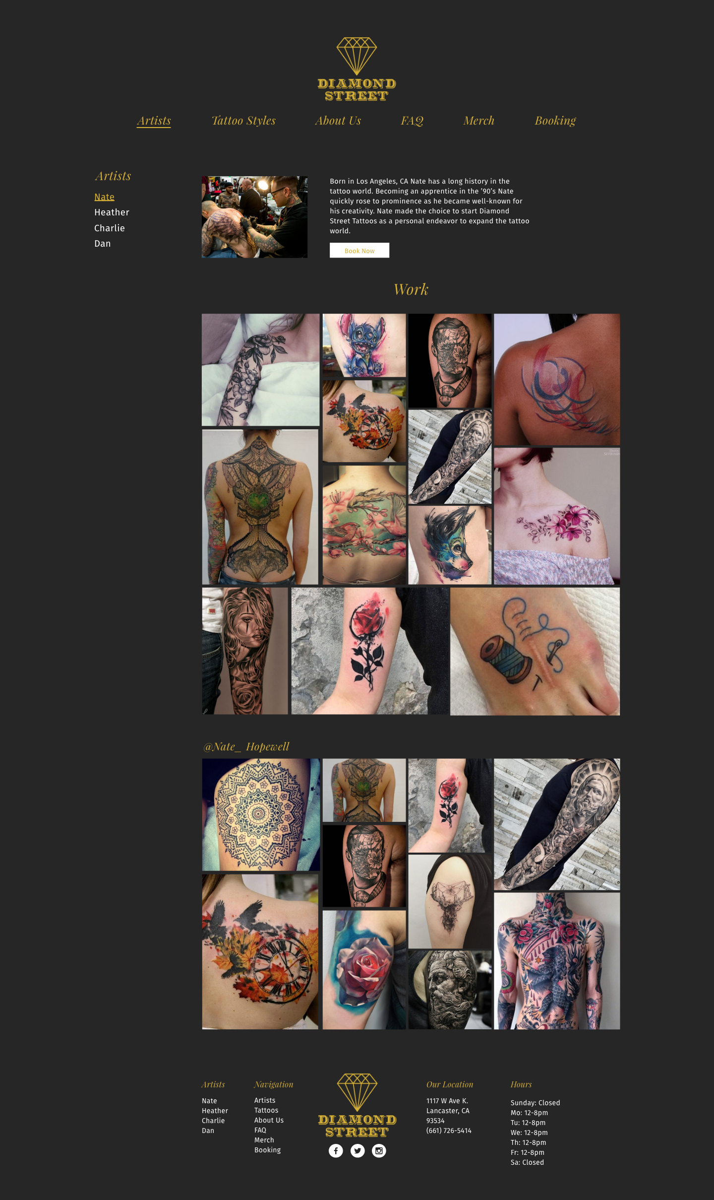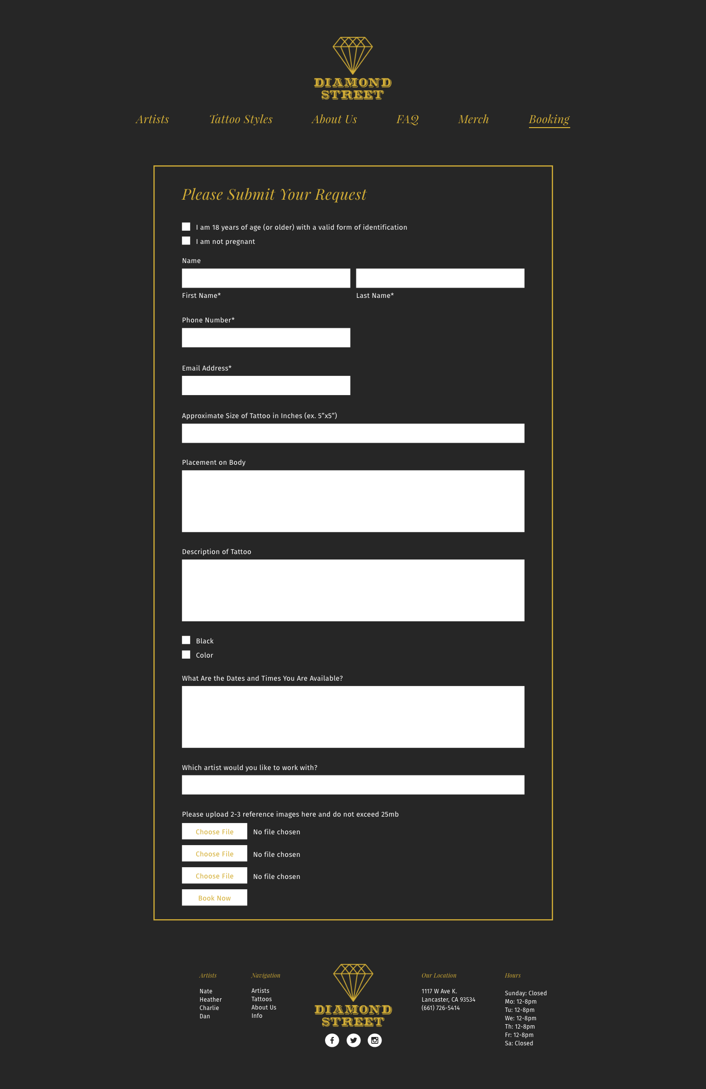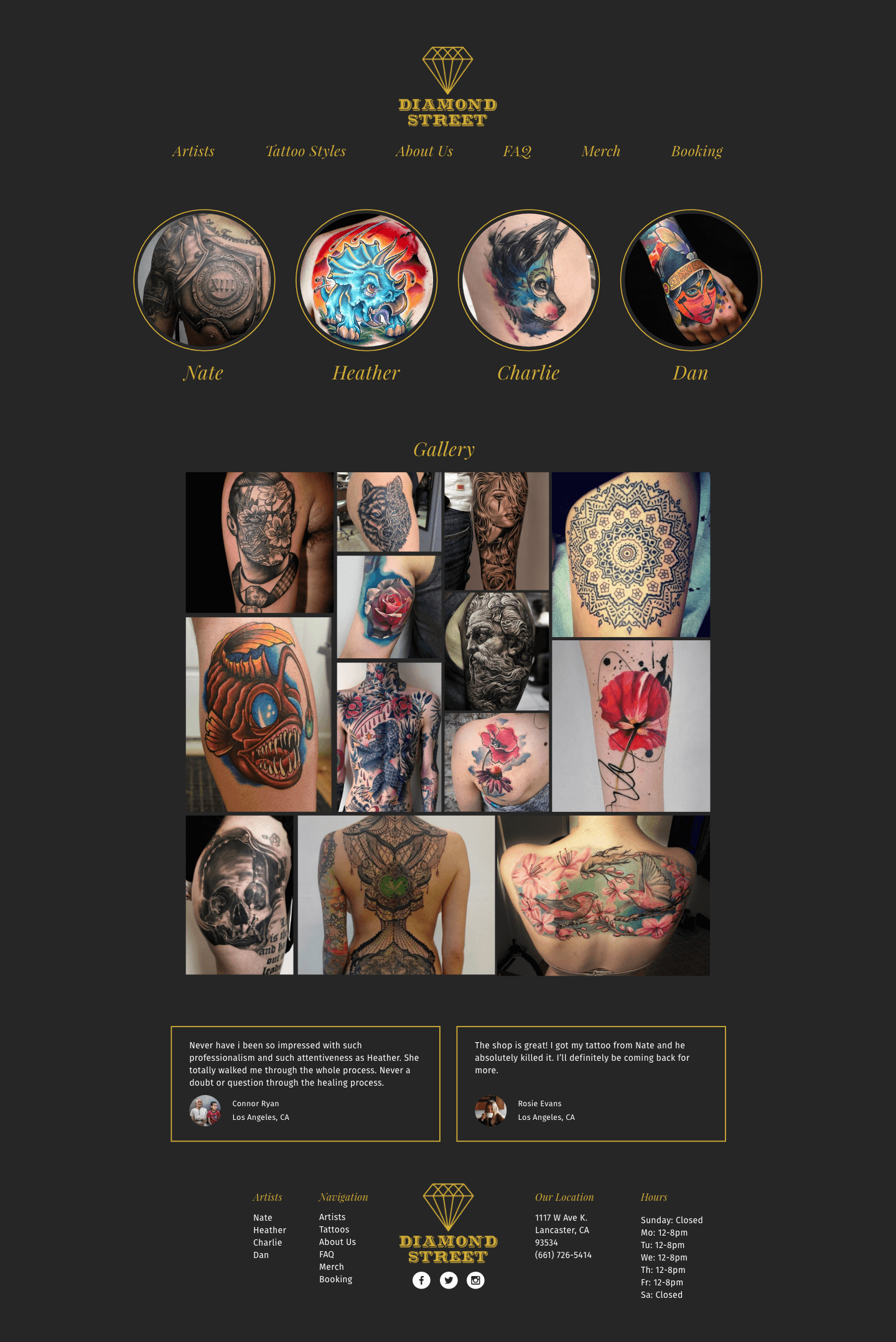 When I first began working with Diamond Street, the tattoo shop lacked a clear design direction and struggled to stand out in a crowded market of numerous tattoo shops across Los Angeles. Without a proper website, they had no platform to differentiate themselves from competitors. Through my design process, I was able to help them define their target clientele, understand the specific needs of their business, and craft a design that truly reflects the unique aesthetic of their brand. The result is a website that not only highlights the artistic vibe of the shop but also provides a streamlined user experience, giving Diamond Street a distinct online identity that sets them apart in a competitive industry.
