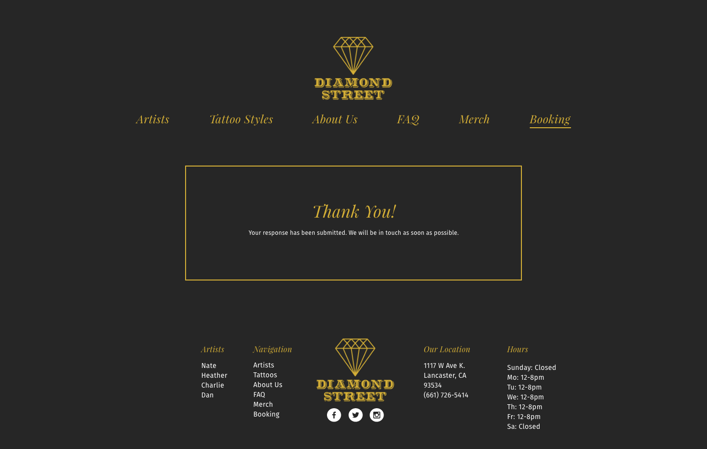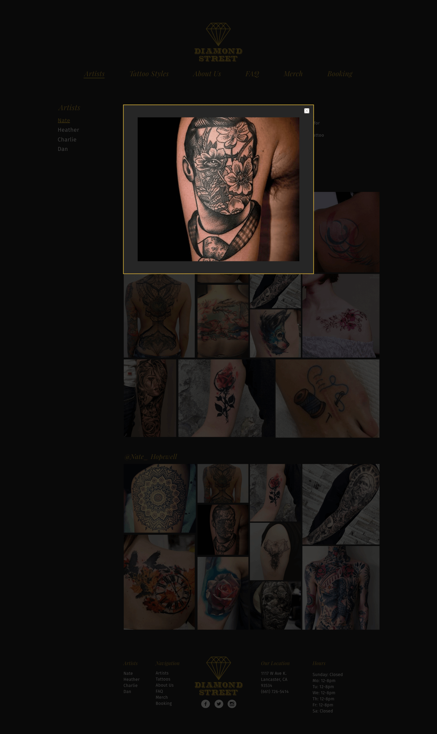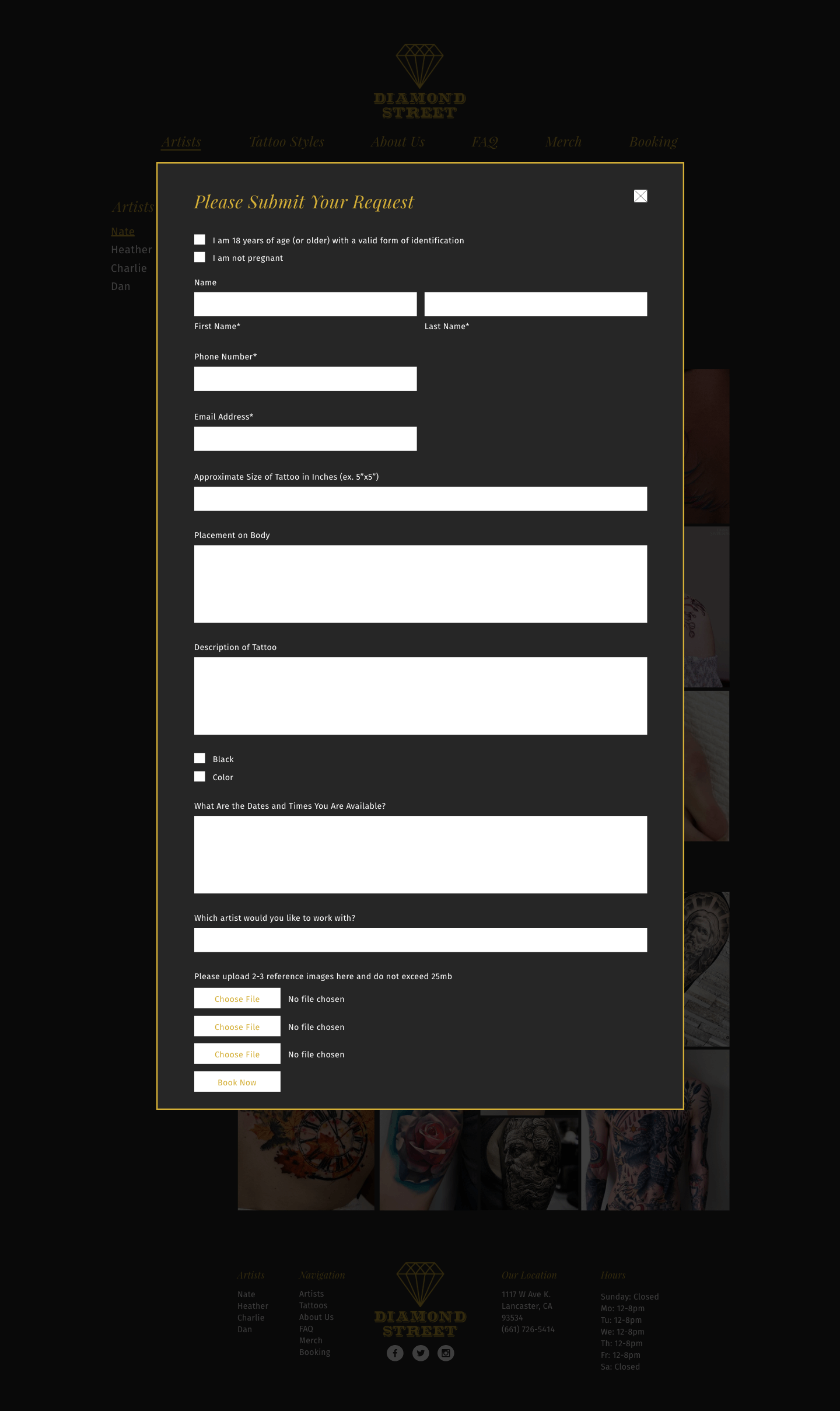 When I first began working with Diamond Street, the tattoo shop lacked a clear design direction and struggled to stand out in a crowded market of numerous tattoo shops across Los Angeles. Without a proper website, they had no platform to differentiate themselves from competitors. Through my design process, I was able to help them define their target clientele, understand the specific needs of their business, and craft a design that truly reflects the unique aesthetic of their brand. The result is a website that not only highlights the artistic vibe of the shop but also provides a streamlined user experience, giving Diamond Street a distinct online identity that sets them apart in a competitive industry.