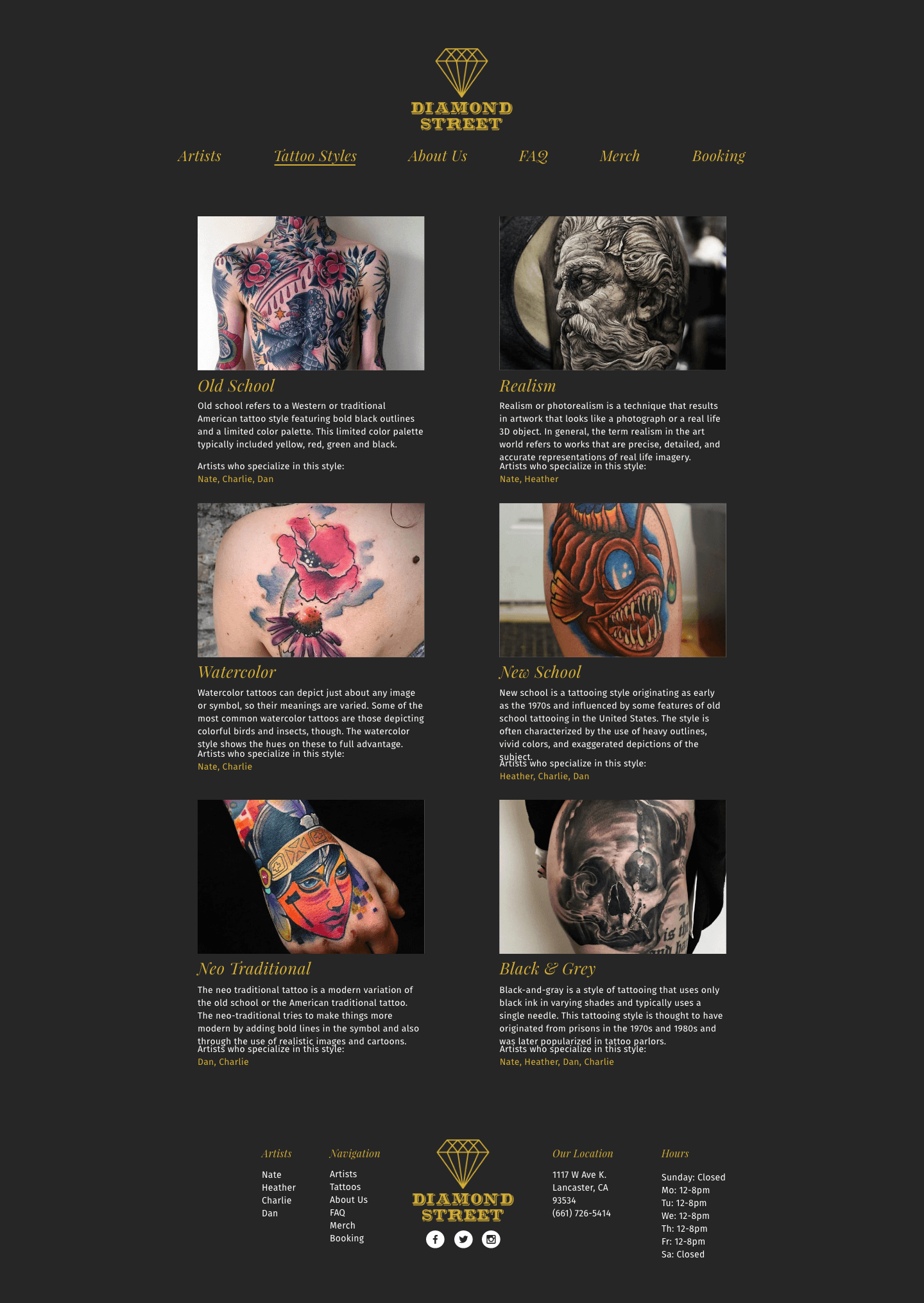 With my style tile finished and my design elements all finalized I was able to move onto the final design of the website. I took my design elements, my mid-fidelity wireframes and the findings from my usability testings to create the final layout for Diamond Street Tattoo.